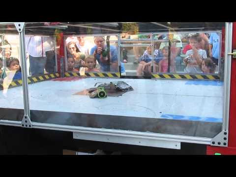 The same competition, but against a nimble opponent. As you can see Gyro King cannot really do anything. It wins only through the error of the opposing operator accidentally driving into the pit, taking himself out of the match.